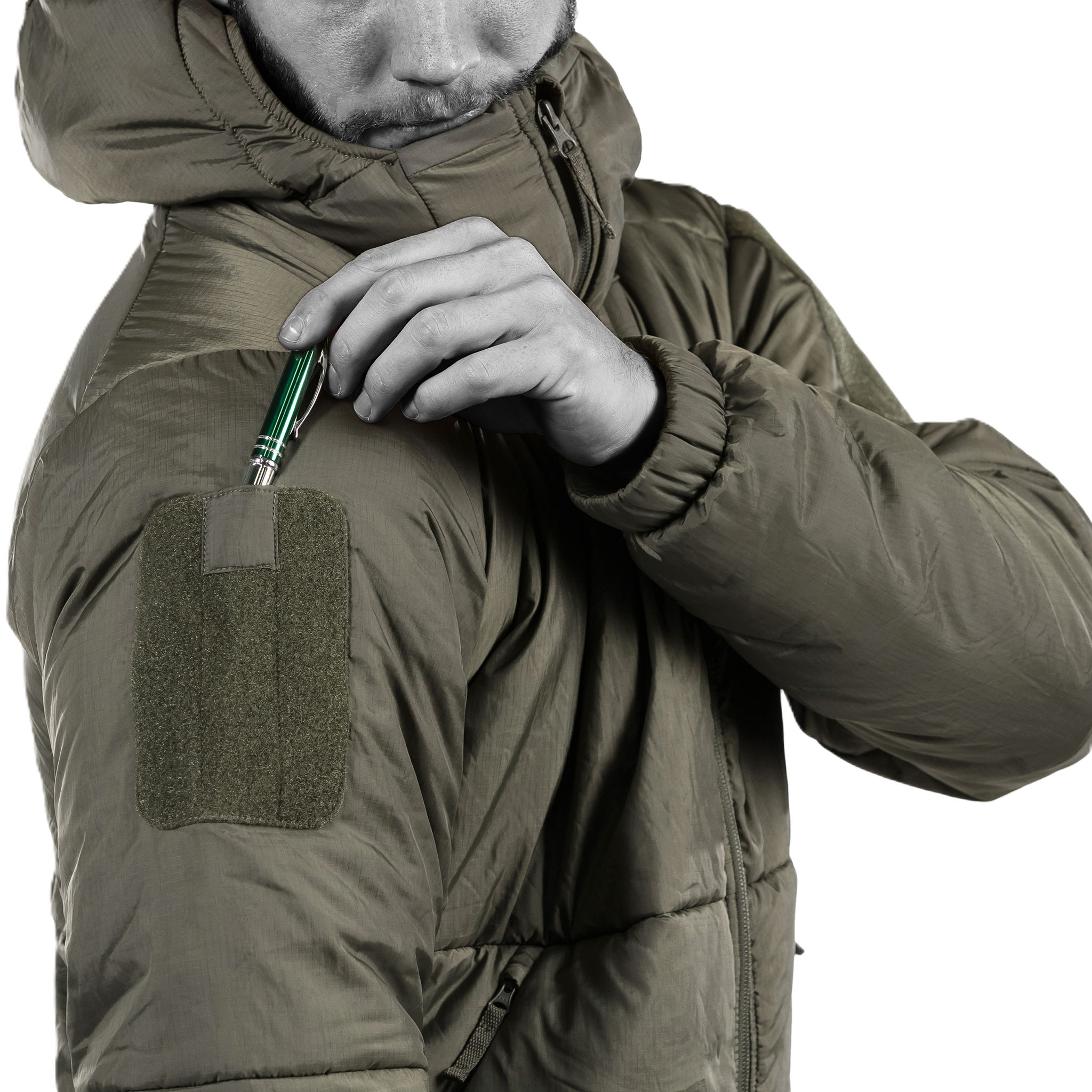-Olkapäässä velcroalueet kynätaskulla